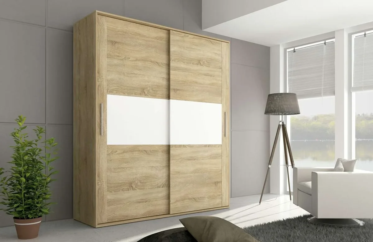 Te presentamos este elegante y moderno armario de 2 puertas correderas (180 x 208 cm), con un sofisticado acabado en Cambria y detalle en blanco que combina perfectamente con cualquier decoración.