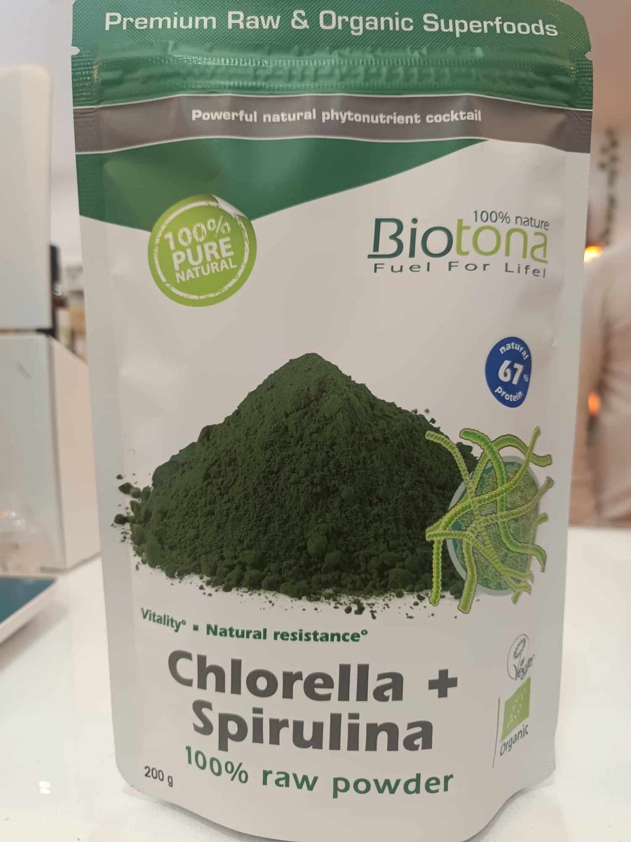 Biotona Chlorella + Spirulina Raw Powder Bio es una mezcla ecológica 100% pura de dos microalgas de agua dulce: chlorella (50%) y spirulina (50%), cuidadosamente deshidratadas mediante un proceso de secado de alta calidad para preservar su valor nutricional.