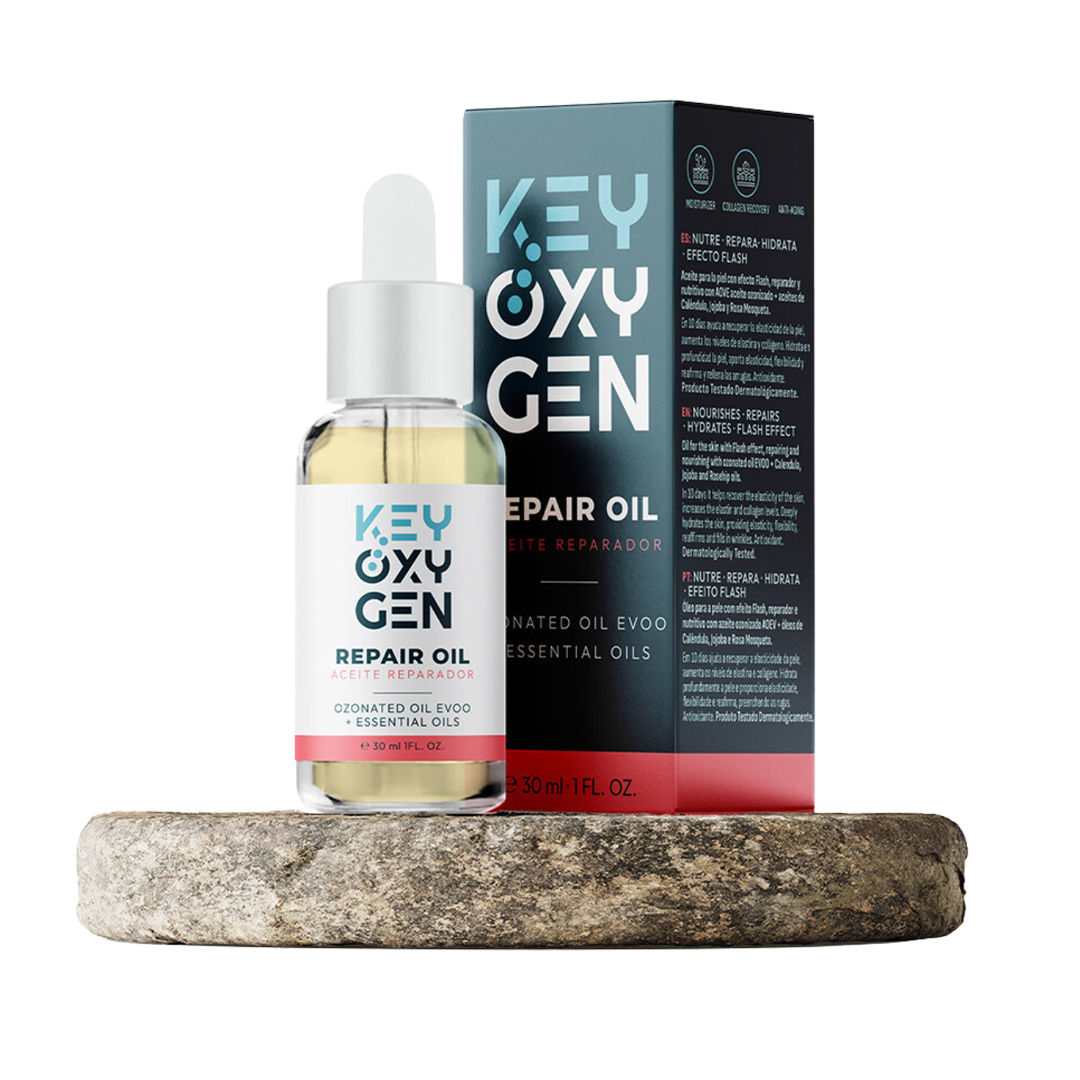 KeyOxygen Repair Oil es un aceite reparador y nutritivo formulado con AOVE ozonizado y una sinergia de aceites vegetales y esenciales. Está pensado para nutrir, reparar e hidratar con una textura de aceite seco, por lo que ayuda a hidratar sin sensación grasa. Además, se enfoca en mejorar el aspecto de la piel con un enfoque “efecto flash”.