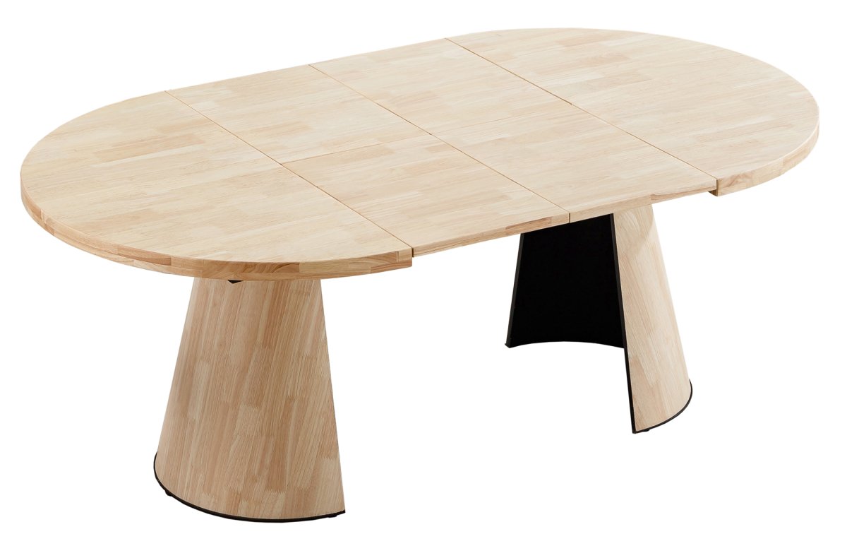 MDF con recubrimiento en madera maciza y chapa de roble. Patas cónicas en madera. Extensible 2 tramos independientes 120 – 160 – 200 cm. Amacenamiento de extensibles bajo la tapa. Medidas: 120 – 160 – 200 x 120 x 76 cm.