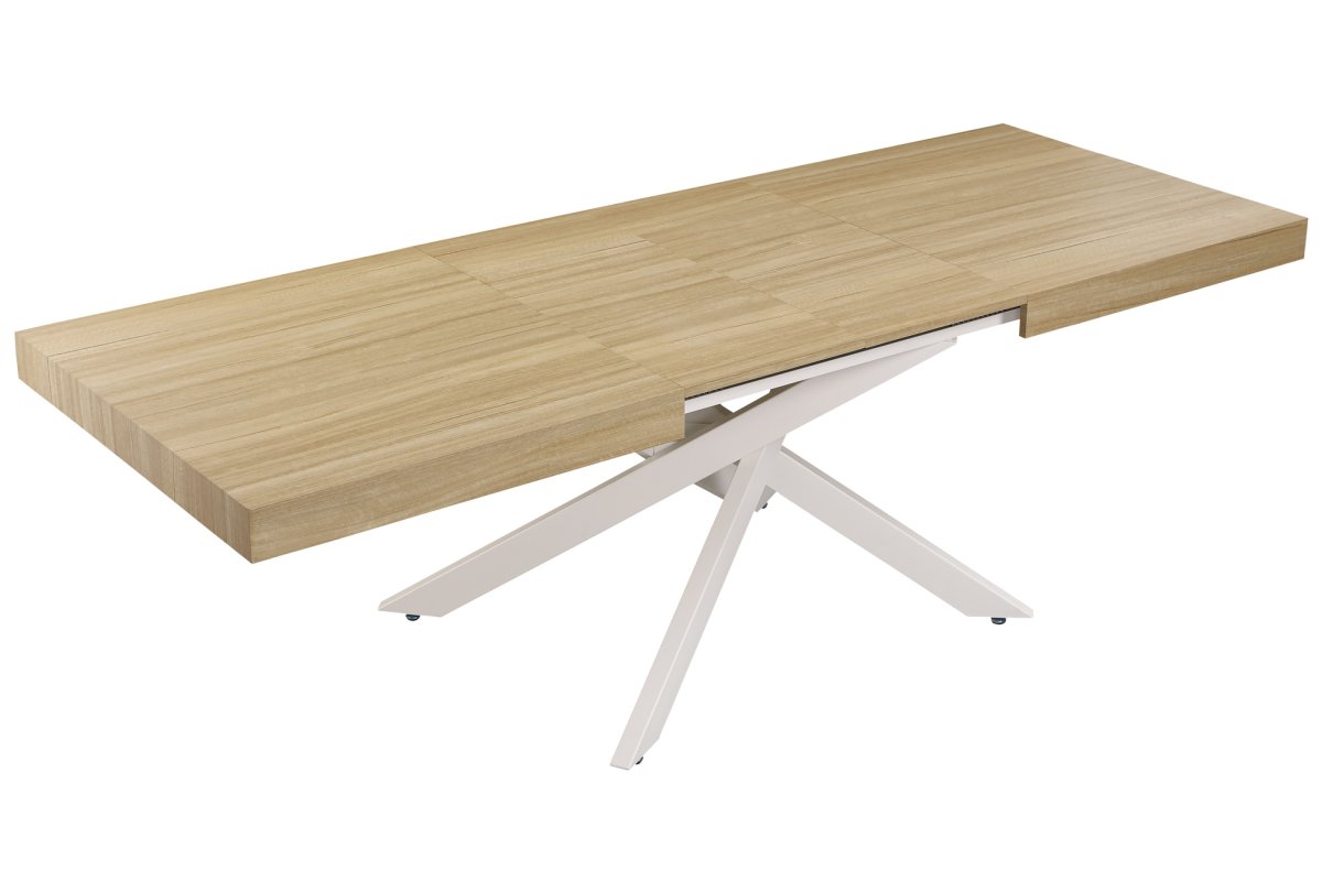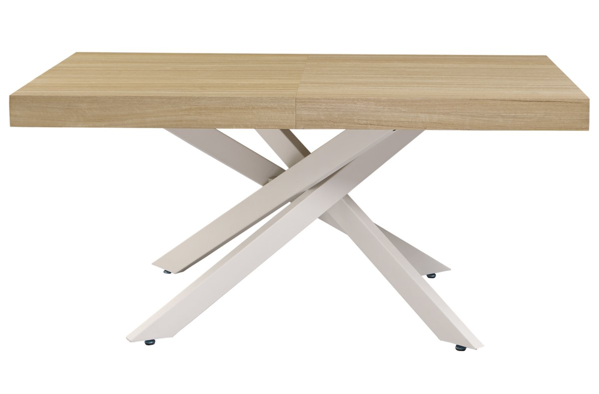 Mesa comedor extensible. 2 extensibles independientes bajo la tapa. Extensible a 200 o 240 cm. Tapa en MDF 18 mm grosor y papel laminado 3D. Grosor borde tapa 90 mm. Patas metálicas color blanco. Medidas: 160 – 200- 240 x 90 x 76 cm.