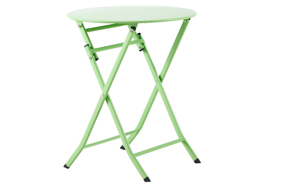 Set cafe compuesto por una mesa redonda y dos sillas. Uso exterior / interior. Mesa y sillas plegables. Conjunto completo fabricado en metal. Color pistacho. Medidas mesa: 60 x 60 x 71,5 cm. Medidas sillas: 38 x 42 x 80 cm.