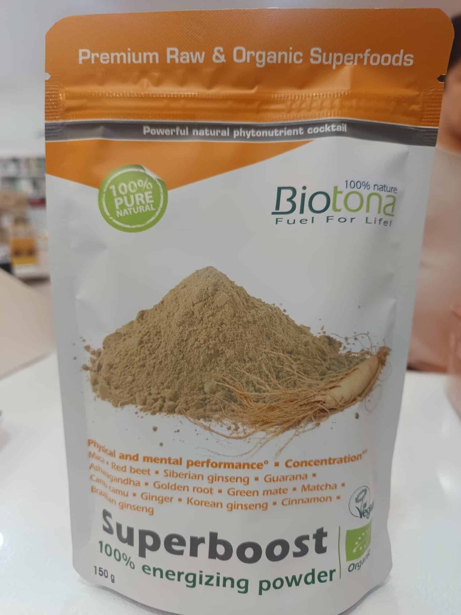 Biotona Bio Superboost 150g es un superfood energizante vegano en polvo, elaborado con 100% polvo puro y con ingredientes de cultivo ecológico. Está diseñado para apoyar el rendimiento físico y mental, especialmente en periodos cargados o estresantes.
